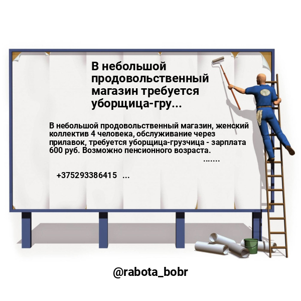 В небольшой продовольственный магазин, женский коллектив 4 человека, обслуживание через прилавок, требуется уборщица-грузчица — зарплата 600 руб. Возможно пенсионного возраста.