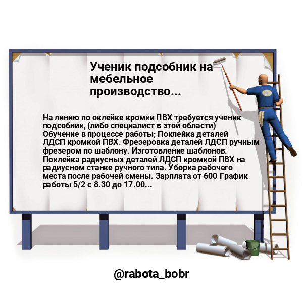 На линию по оклейке кромки ПВХ требуется ученик подсобник, (либо специалист в этой области) Обучение в процессе работы; Поклейка деталей ЛДСП кромкой ПВХ. Фрезеровка деталей ЛДСП ручным фрезером по шаблону. Изготовление шаблонов. Поклейка радиусных деталей ЛДСП кромкой ПВХ на радиусном станке ручного типа. Уборка рабочего места после рабочей смены. Зарплата от 600 График работы 5/2 с 8.30 до 17.00, выходные: суббота, воскресенье.