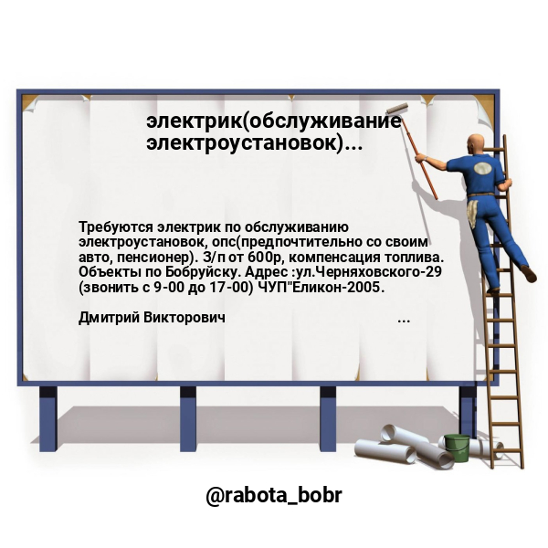 Требуются электрик по обслуживанию электроустановок, опс(предпочтительно со своим авто, пенсионер). З/п от 600р, компенсация топлива. Объекты по Бобруйску.