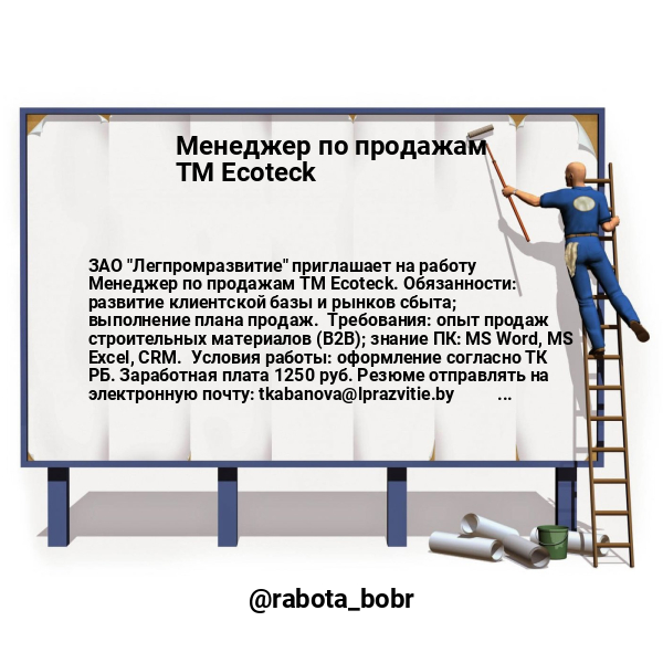 ЗАО "Легпромразвитие" приглашает на работу Менеджер по продажам TM Ecoteck. Обязанности: развитие клиентской базы и рынков сбыта; выполнение плана продаж.