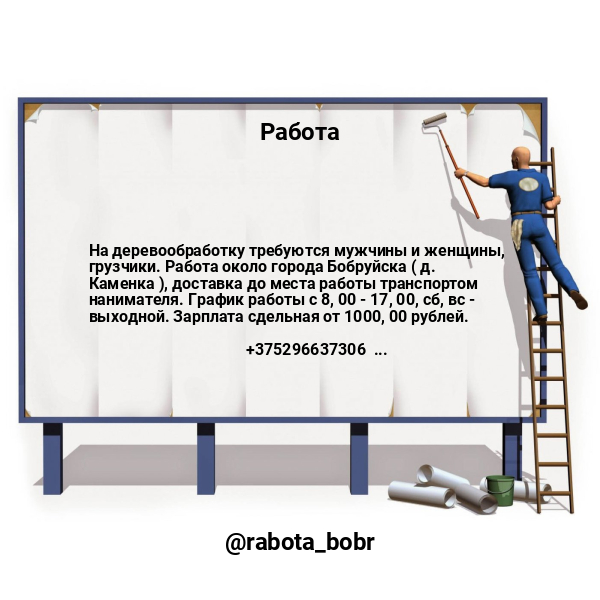 На деревообработку требуются мужчины и женщины, грузчики. Работа около города Бобруйска ( д. Каменка ), доставка до места работы транспортом нанимателя. График работы с 8, 00 — 17, 00, сб, вс — выходной. Зарплата сдельная от 1000, 00 рублей.