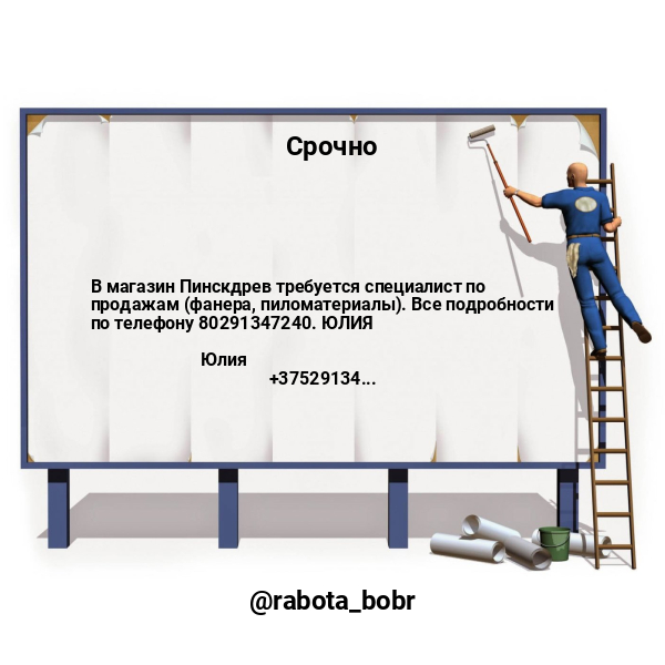 В магазин Пинскдрев требуется специалист по продажам (фанера, пиломатериалы). Все подробности по телефону 80291347240. ЮЛИЯ