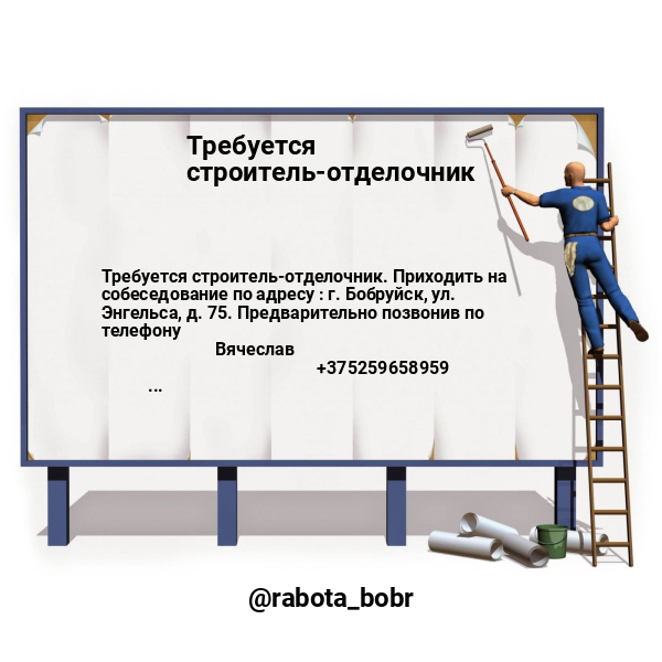 Требуется строитель-отделочник. Приходить на собеседование по адресу : г. Бобруйск, ул. Энгельса, д. 75. Предварительно позвонив по телефону