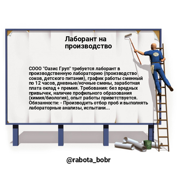 СООО "Оазис Груп" требуется лаборант в производственную лабораторию (производство соков, детского питания), график работы сменный по 12 часов, дневные/ночные смены, заработная плата оклад + премия.