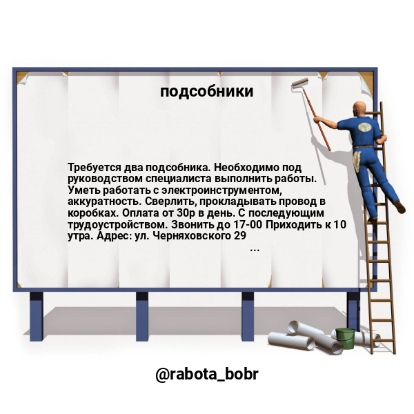 Требуется два подсобника. Необходимо под руководством специалиста выполнить работы. Уметь работать с электроинструментом, аккуратность. Сверлить, прокладывать провод в коробках. Оплата от 30р в день. С последующим трудоустройством. Звонить до 17-00