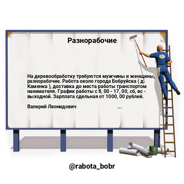 На деревообработку требуются мужчины и женщины, разнорабочие. Работа около города Бобруйска ( д. Каменка ), доставка до места работы транспортом нанимателя. График работы с 8, 00 — 17, 00, сб, вс — выходной. Зарплата сдельная от 1000, 00 рублей.