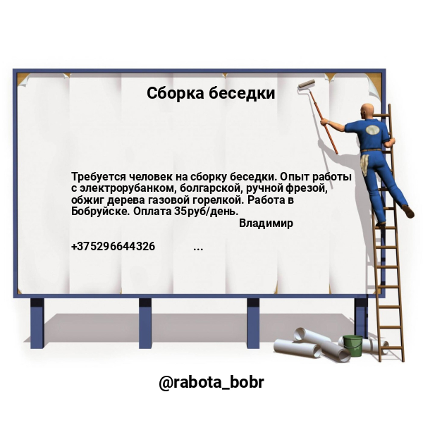 Требуется человек на сборку беседки. Опыт работы с электрорубанком, болгарской, ручной фрезой, обжиг дерева газовой горелкой. Работа в Бобруйске. Оплата 35руб/день.