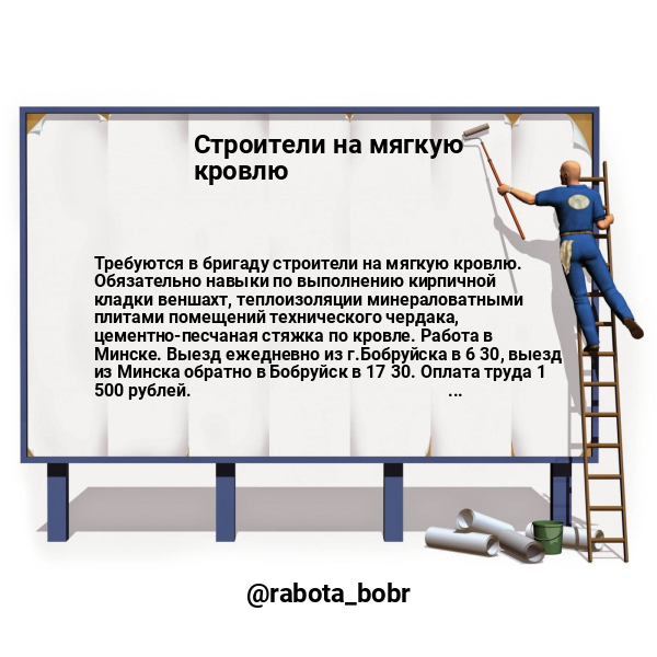 Требуются в бригаду строители на мягкую кровлю. Обязательно навыки по выполнению кирпичной кладки веншахт, теплоизоляции минераловатными плитами помещений технического чердака, цементно-песчаная стяжка по кровле. Работа в Минске. Выезд ежедневно из г.Бобруйска в 6 30, выезд из Минска обратно в Бобруйск в 17 30. Оплата труда 1 500 рублей.