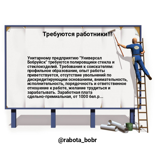 Унитарному предприятию "Универсал Бобруйск" требуются полировщики стекла и стеклоизделий. Требования к соискателям: профильное образование, опыт работы приветствуется, отсутствие увольнений по дискредитирующим основаниям, внимательность, исполнительность, порядочность и ответственное отношение к работе, желание трудиться и зарабатывать. Заработная плата сдельно-премиальная, от 1000 бел.руб. Гарантированное трудоустройство, полный социальный пакет, предоставление служебного жилья. Звонить по телефону — 721677.